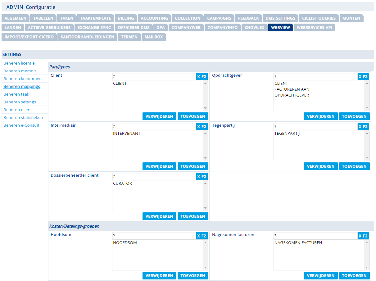 Hier kunt u de mappings van de Partijtypes en Incasso zaken (Kosten/Betalings -groepen) beheren.