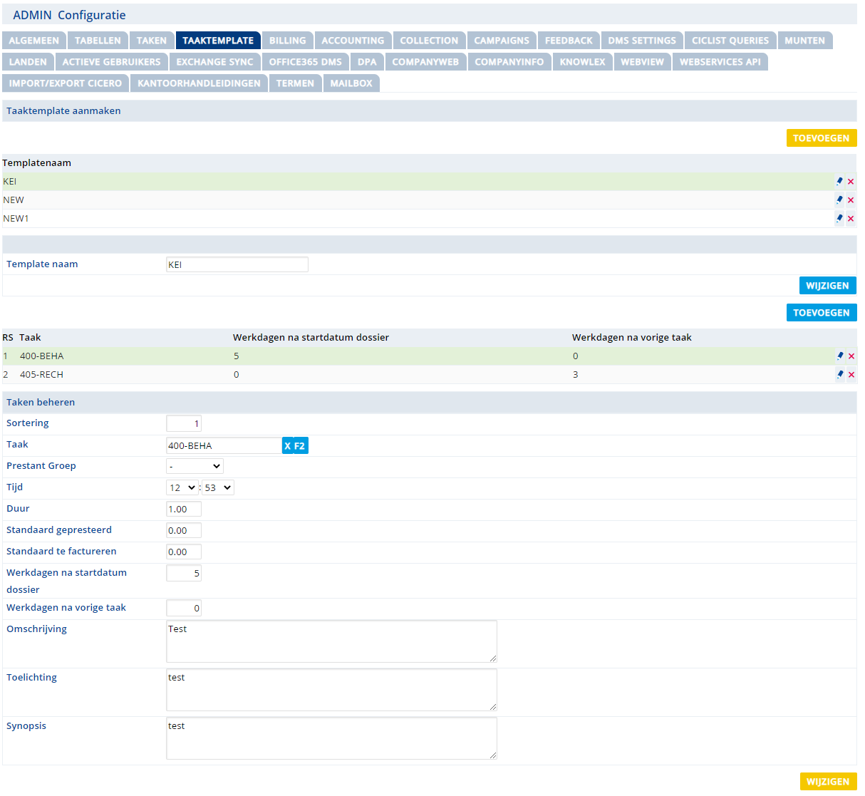 Wanneer u een dossier aanmaakt via de Wizard functionaliteit is het raadzaam om met voorgedefinieerde taaktemplates te werken. Zo kunt u in een keer een standaard rij aan taken selecteren voor het dossier dat u aanmaakt en hoeft u de taken niet per stuk in te voeren. In de rubriek Taaktemplates maakt u de taaktemplates aan.