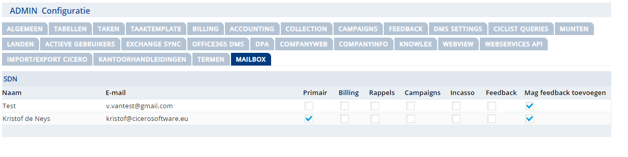 Bij Notificaties kunt u een default Afzender e-mail (exchange) en een Ontvanger notificatie e-mailadres ingeven.